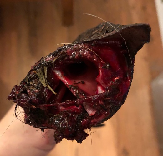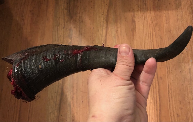 Star partially broke her horn not far into the vascularized area. In this case, we opted to leave the horn’s broken portion to allow the vascularized area to clot and heal. Once healed, the fragile, broken tip fell off. If removing the broken area, be prepared to apply pressure to stem bleeding and a clotting agent— such as spiderwebs, styptic powder, cornstarch, or turmeric. If you cannot stop the blood flow, you may cauterize it using a disbudding iron, and if none is available, a red-hot piece of iron. Apply pressure to the bleeding area for 2 seconds at a time. Do not apply first aid products to cauterized tissue, as it needs to remain dry. Cover the injury for a few days if flies or contamination are a risk.