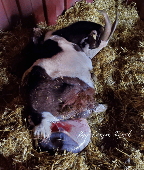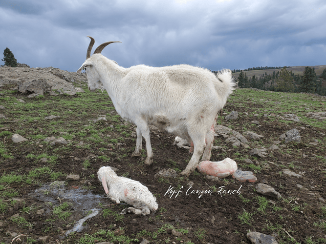 If we’re present, we just watch, unless there’s difficulty. Because the amniotic membrane in livestock tends to be thicker than in humans, caul births tend to be more frequent, though no concrete data exists (Merck Veterinary Manual, 2023). It isn’t unusual at all for us to see the amnion (the thin membrane forming a closed sac around the fetus) as the first presentation showing imminent birth with goats, rather than “water breaking,” as reported by most women. An intact sac can help cushion the delivery of a newborn to animals born standing up — or in the case of our doe, Kopf Canyon Crocus — delivering standing up on rocks!