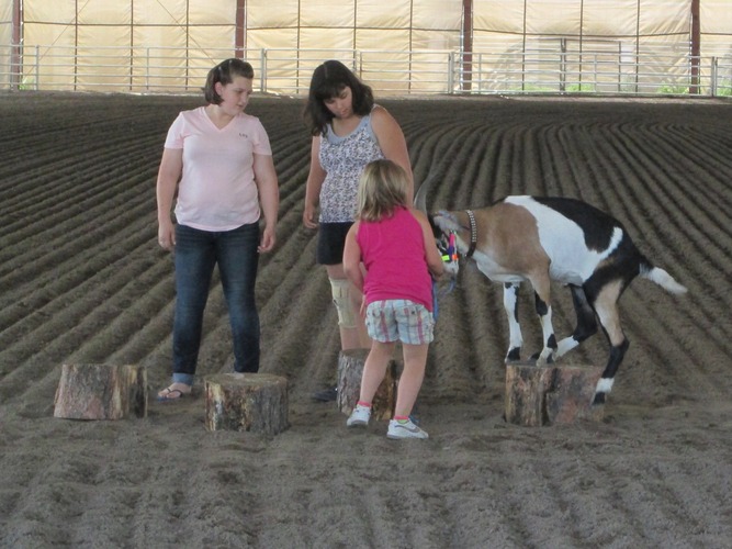 That said, always include several easy, confidence-building obstacles in every trail class. There’s nothing sadder than watching a child and their goat being repeatedly defeated and discouraged. If a child (or new handler) is having a lot of difficulty, step in and help them out. Encourage them, teach them some handling skills, reassure the goat, and find at least one or two things they can succeed at. Always bring a pocketful of goat treats to entice nervous or stubborn goats and make it a positive experience for everyone involved.
