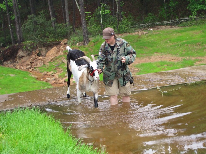 While it’s tempting to make your obstacles really challenging for the audience’s amusement, bear in mind that excess difficulty makes the class take too long, and it’s unfair to both the goats and their handlers. A classic example is the water obstacle. For goats, a puddle might as well be a pool of acid, and, while it’s amusing to watch a series of children get soaked, muddied, and knocked down in their vain attempts to drag protesting goats into the water, it’s not really fair to the kids or the goats. A trained pack goat should be expected to cross water without balking, but for any other type of goat, it’s an unfair ask.